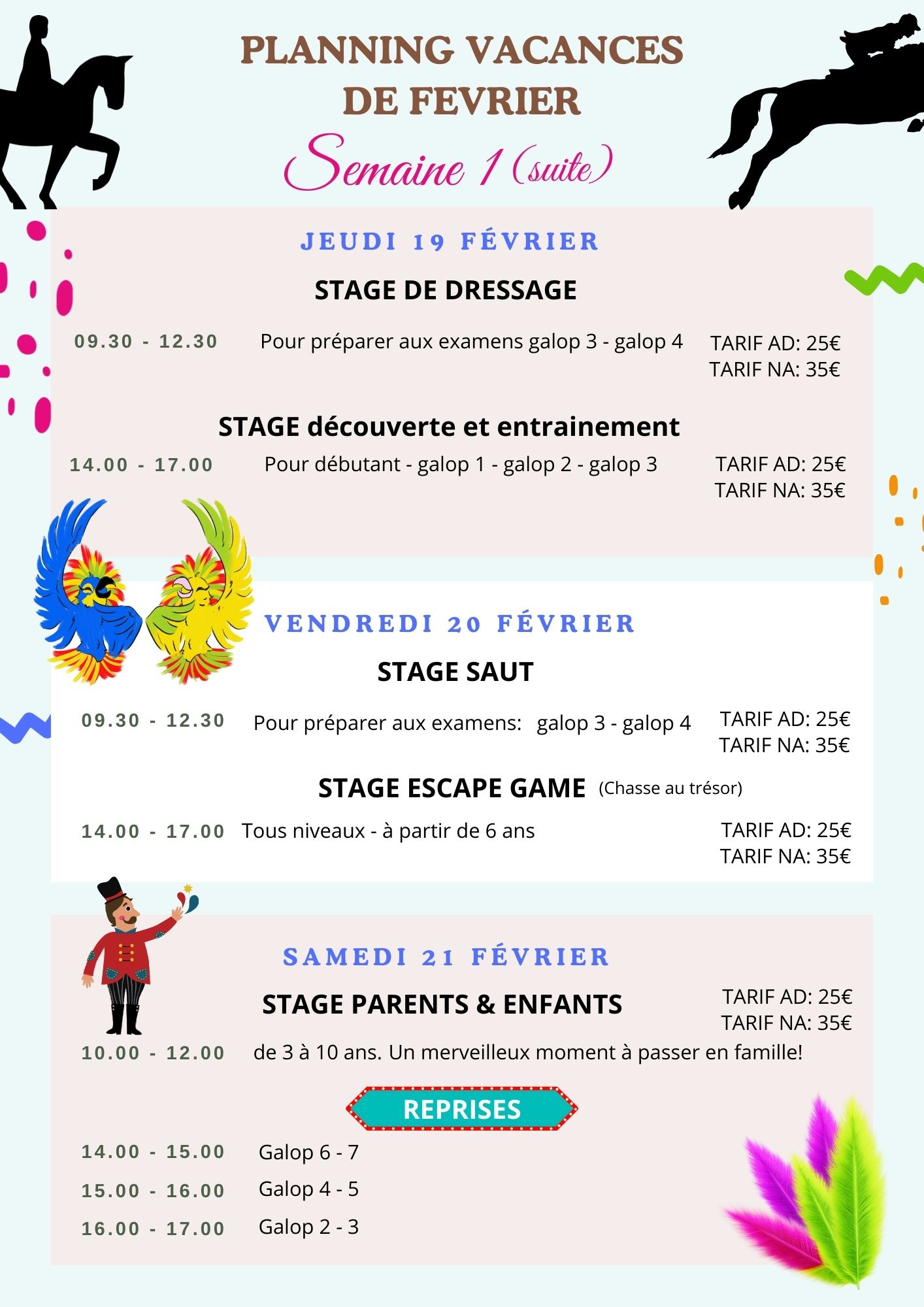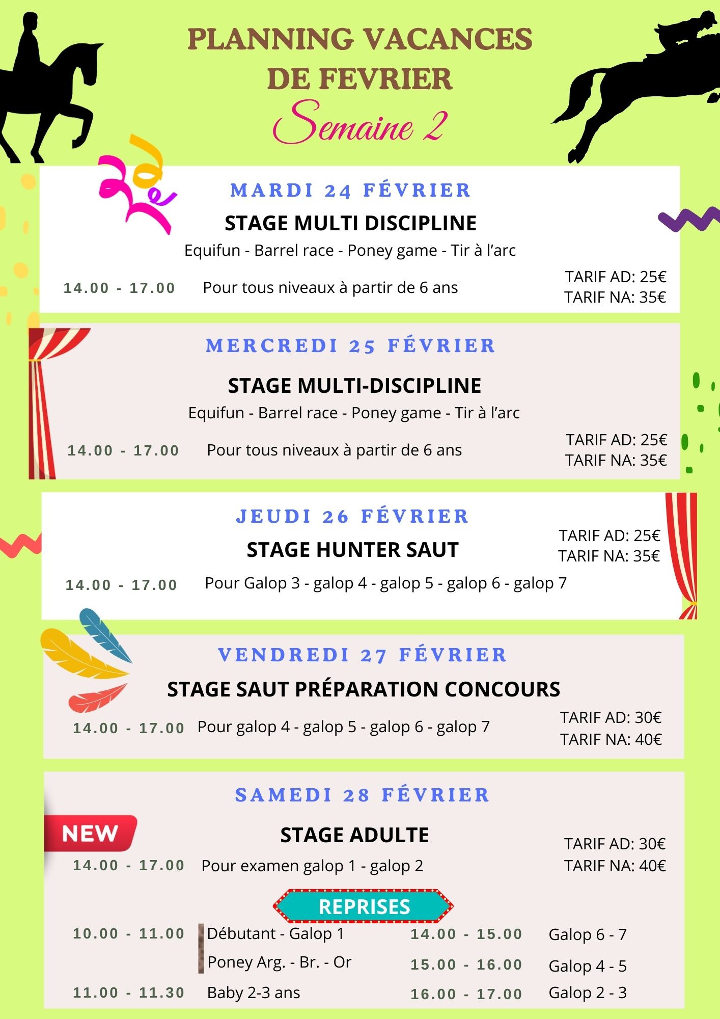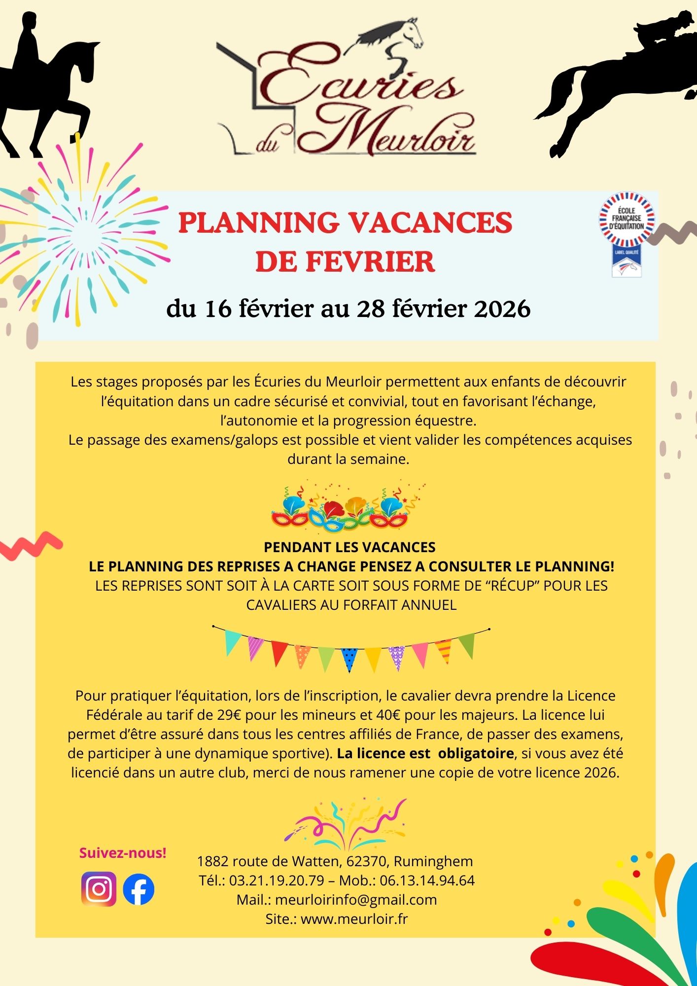 Planning VACANCES Stages d'équitation à Ruminghem - FÉVRIER 2026 Cliquez ici pour télécharger le planning Des vacances FUN, des poneys, des activités à gogo… et un super évènement le 17 février 2026! Ne manquez pas ça! Inscrivez-vous vite!